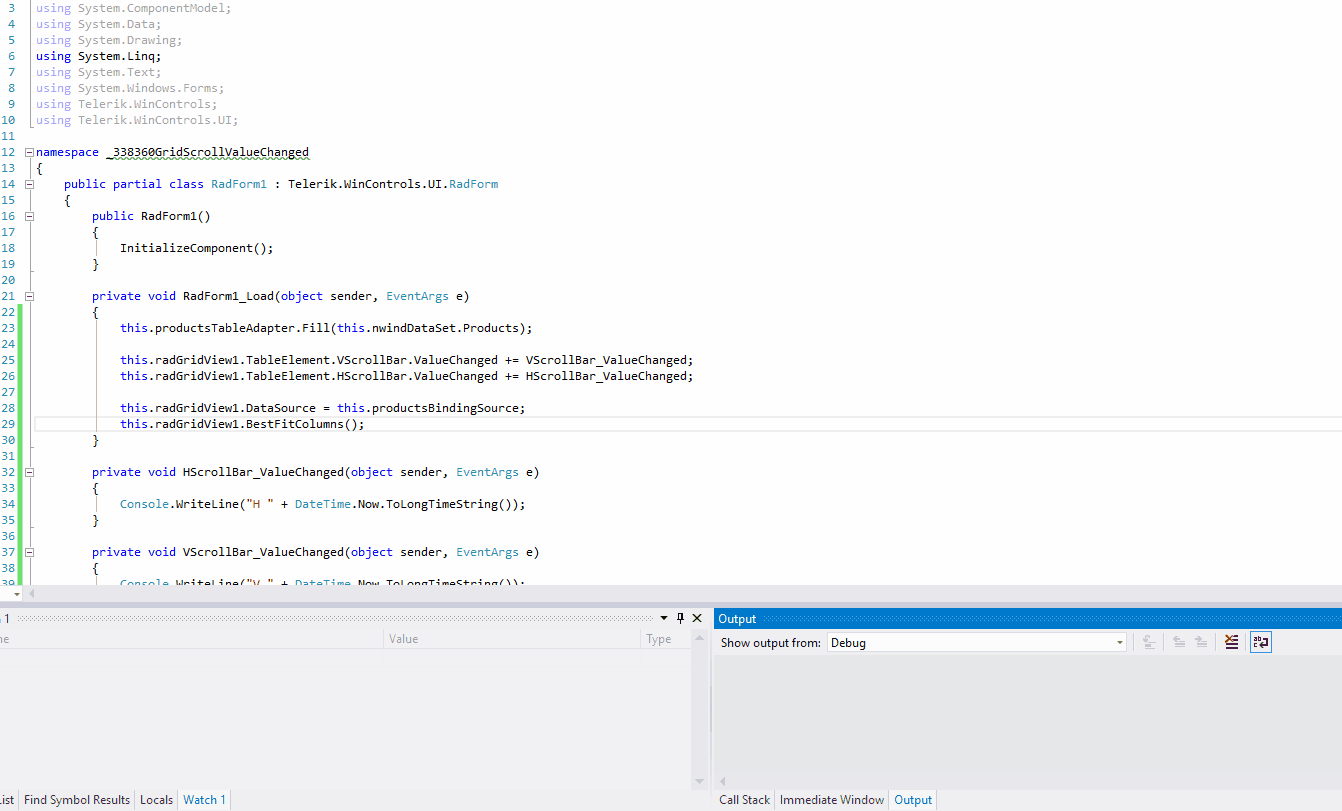 Thank you for sharing your tip with the community.However, the ValueChanged event for the horizontal/vertical scrollbars are successfully fired on my end event when I subscribe to the ValueChanged event before setting the RadGridView.DataSource. Please refer to the attached gif file. Am I missing something?