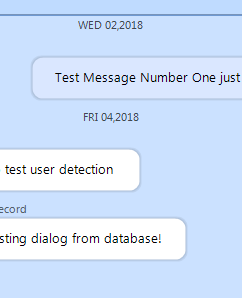 this.radChat1.ChatElement.MessagesViewElement.TimeSeparatorInterval = TimeSpan.Zero;var a = new Author(null, "Test");for (int i = 0; i < 20; i++){ radChat1.AddMessage(new ChatTextMessage("Item" + i, a, DateTime.Now.AddDays(-(20 - i)))); ChatTimeSeparatorDataItem separator = new ChatTimeSeparatorDataItem(new ChatTimeSeparatorMessage(DateTime.Now.AddDays(-(20 - i)))); radChat1.ChatElement.MessagesViewElement.Items.Add(separator);}Should you have any other questions do not hesitate to ask.