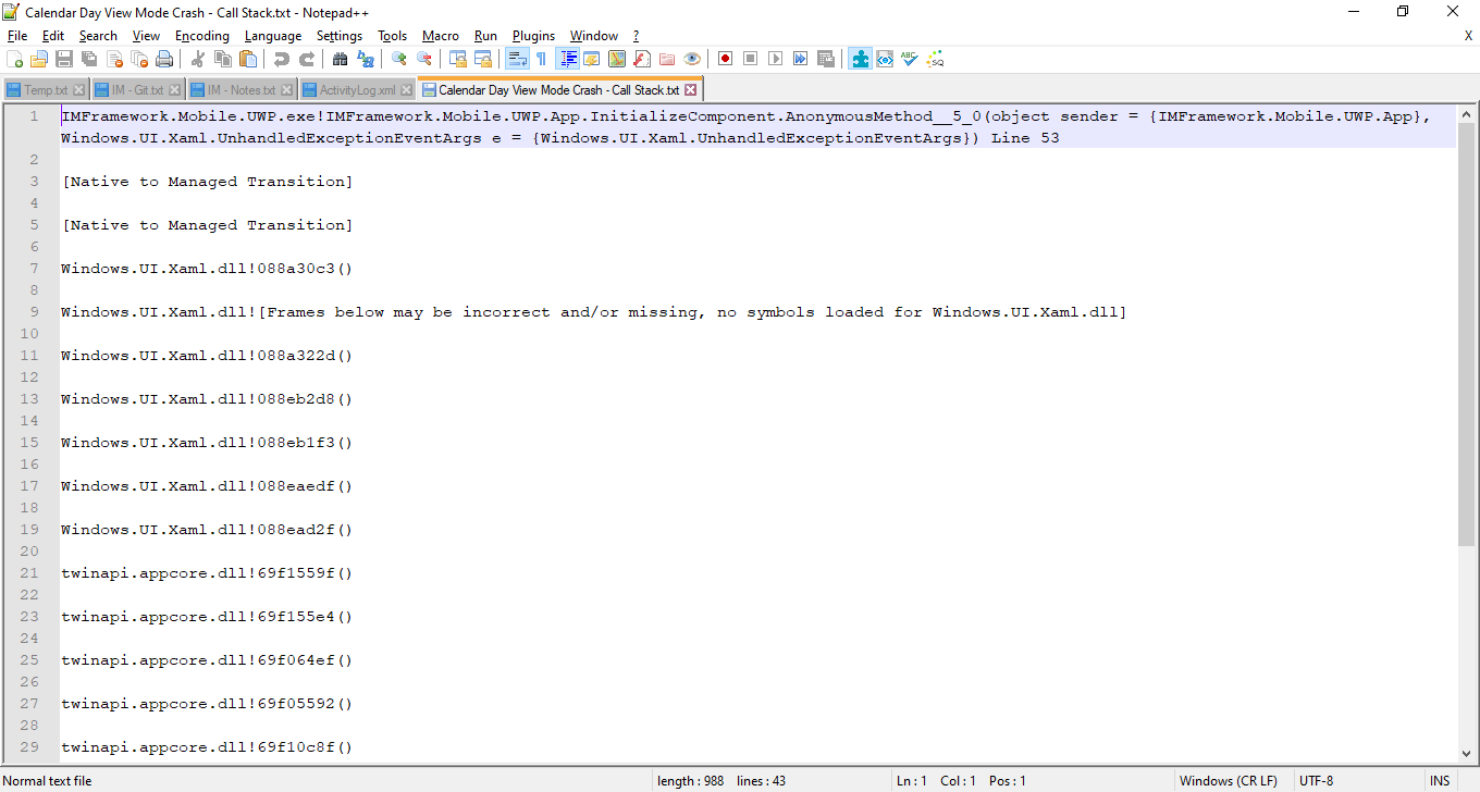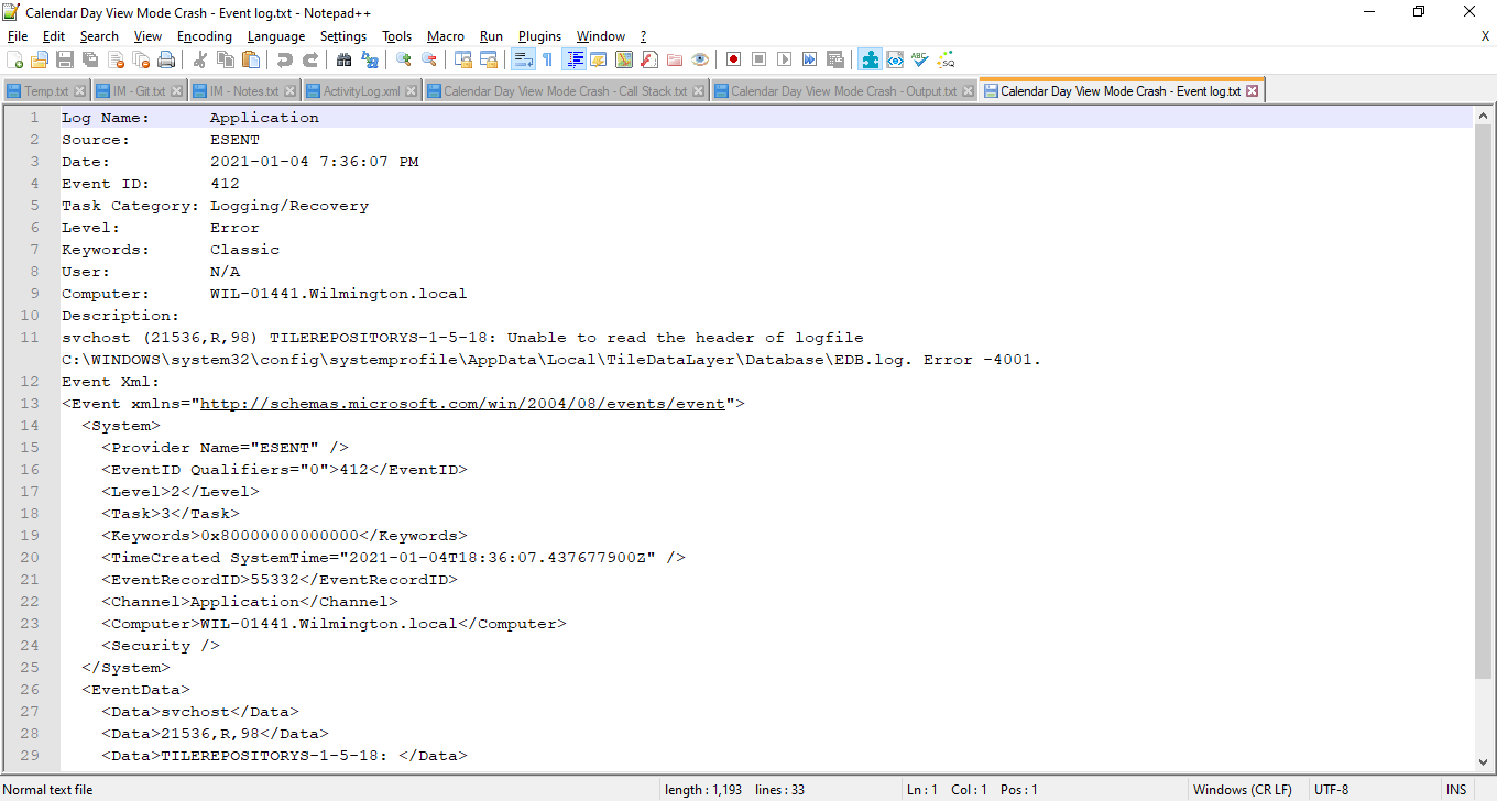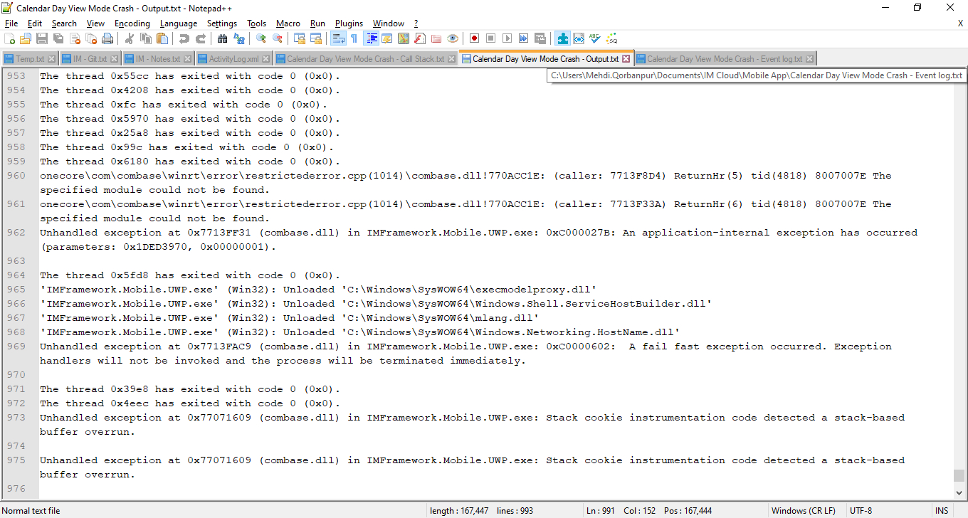 In addition to the Call Stack, I have also attached the Output and an Event log, which hope to be useful.