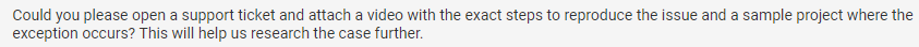 Could you please open a support ticket and attach a video with the exact steps to reproduce the issue and a sample project where the exception occurs? This will help us research the case further.