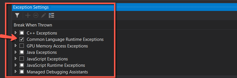 2. In the Exception Settings tab, check the “Common Language Runtime Exceptions” so the check mark to be visualized.