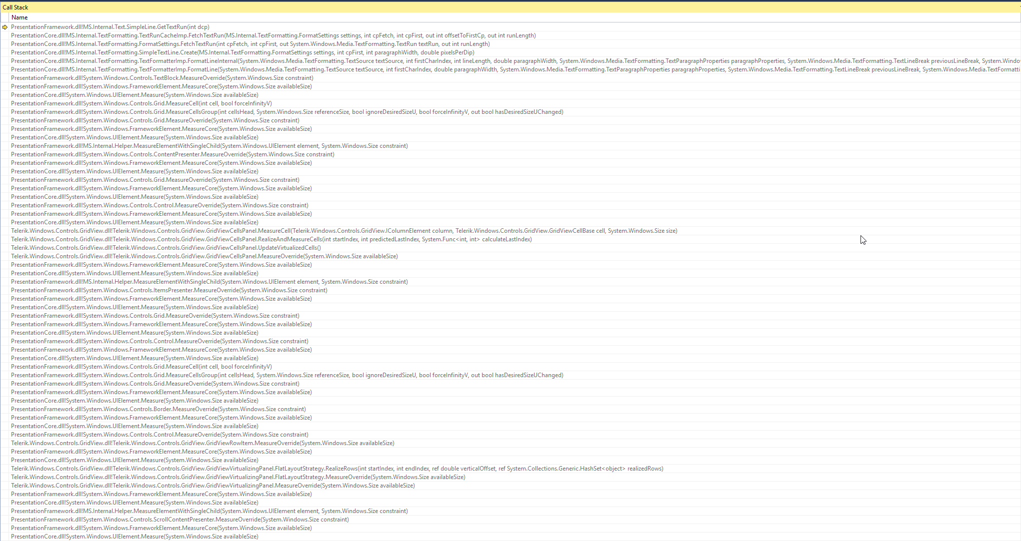 public override FrameworkElement CreateCellElement(GridViewCell cell, object dataItem) { if (cell.Content != null) return cell.Content as Grid; if (DataMemberBinding == null) return null; //Grid contentGrid = cell.Content as Grid ?? CreateCellContent(cell); //return contentGrid; var gridView = DataControl; Grid result = new Grid { HorizontalAlignment = HorizontalAlignment.Stretch, VerticalAlignment = VerticalAlignment.Stretch }; result.ColumnDefinitions.Add(new ColumnDefinition { Width = new GridLength(1, GridUnitType.Star) }); result.ColumnDefinitions.Add(new ColumnDefinition { Width = new GridLength(1, GridUnitType.Auto) }); // Note TextBlock NoteTextBlock noteTextBlock = new NoteTextBlock(); noteTextBlock.SetValue(Grid.ColumnProperty, 0); noteTextBlock.HorizontalAlignment = HorizontalAlignment.Stretch; noteTextBlock.VerticalAlignment = VerticalAlignment.Stretch; noteTextBlock.TextAlignment = TextAlignment.Left; noteTextBlock.TextTrimming = TextTrimming.None; noteTextBlock.TextWrapping = TextWrapping.Wrap; noteTextBlock.LineStackingStrategy = LineStackingStrategy.MaxHeight; string rowHeightPath = nameof(gridView.RowHeight); noteTextBlock.SetBinding(FrameworkElement.MaxHeightProperty, new Binding { Source = gridView, Path = new PropertyPath(rowHeightPath) }); noteTextBlock.SetBinding(TextBlock.TextProperty, new Binding(DataMemberBinding.Path.Path)); // { NotifyOnTargetUpdated = true }); // Highlighting: Making sure the search field in radgridview can highlight text in this column noteTextBlock.DataType = DataType; // typeof(String); noteTextBlock.SetBinding(HighlightTextBlock.HighlightTextProperty, new Binding(DataMemberBinding.Path.Path)); cell.SetBinding(GridViewCell.IsHighlightedProperty, new Binding(nameof(NoteTextBlock.ContainsMatch)) { Source = noteTextBlock, Mode = BindingMode.TwoWay }); // TODO: I want the row to become heigher and show the entire text if I succeed at highlighting it //noteTextBlock.PropertyChanged += NoteTextBlock_PropertyChanged; result.Children.Add(noteTextBlock); // trimming textblock (the dots) TextBlock trimTextBlock = new TextBlock(); trimTextBlock.SetValue(Grid.ColumnProperty, 1); trimTextBlock.Margin = new Thickness(1, 0, 0, 0); trimTextBlock.HorizontalAlignment = HorizontalAlignment.Right; trimTextBlock.VerticalAlignment = VerticalAlignment.Bottom; trimTextBlock.Text = "\u2026"; //NoteTrimmedVisibility Binding visibilityBinding = new Binding { Source = noteTextBlock, Path = new PropertyPath(NoteTextBlock.TrimmedVisibilityProperty) }; trimTextBlock.SetBinding(UIElement.VisibilityProperty, visibilityBinding); result.Children.Add(trimTextBlock); return result; }I took an extra look at the problem yesterday. This is what I found: