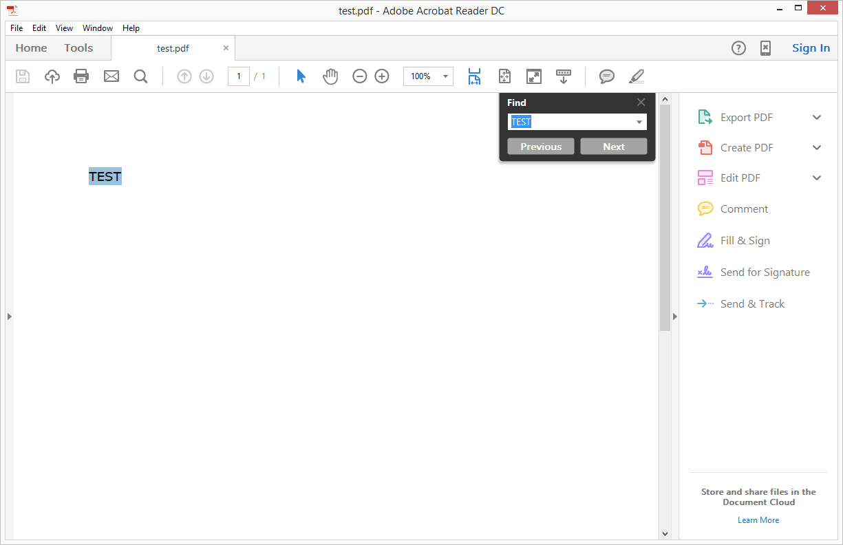 using System.IO;using Telerik.Windows.Documents.FormatProviders.Pdf;using Telerik.Windows.Documents.Model;namespace PdfExportTest{ class Program { static void Main(string[] args) { RadDocument doc = new RadDocument(); RadDocumentEditor editor = new RadDocumentEditor(doc); Section section = new Section(); doc.Sections.Add(section); editor.Document.CaretPosition.MoveToStartOfDocumentElement(section); editor.InsertLine("TEST"); var provider = new PdfFormatProvider(); using (Stream stream = new FileStream(@"C:\\temp\\test.pdf", FileMode.Create)) { provider.Export(doc, stream); } } }}When use search option to find "TEST", Adobe Reader shows it couldn't find any matching words.