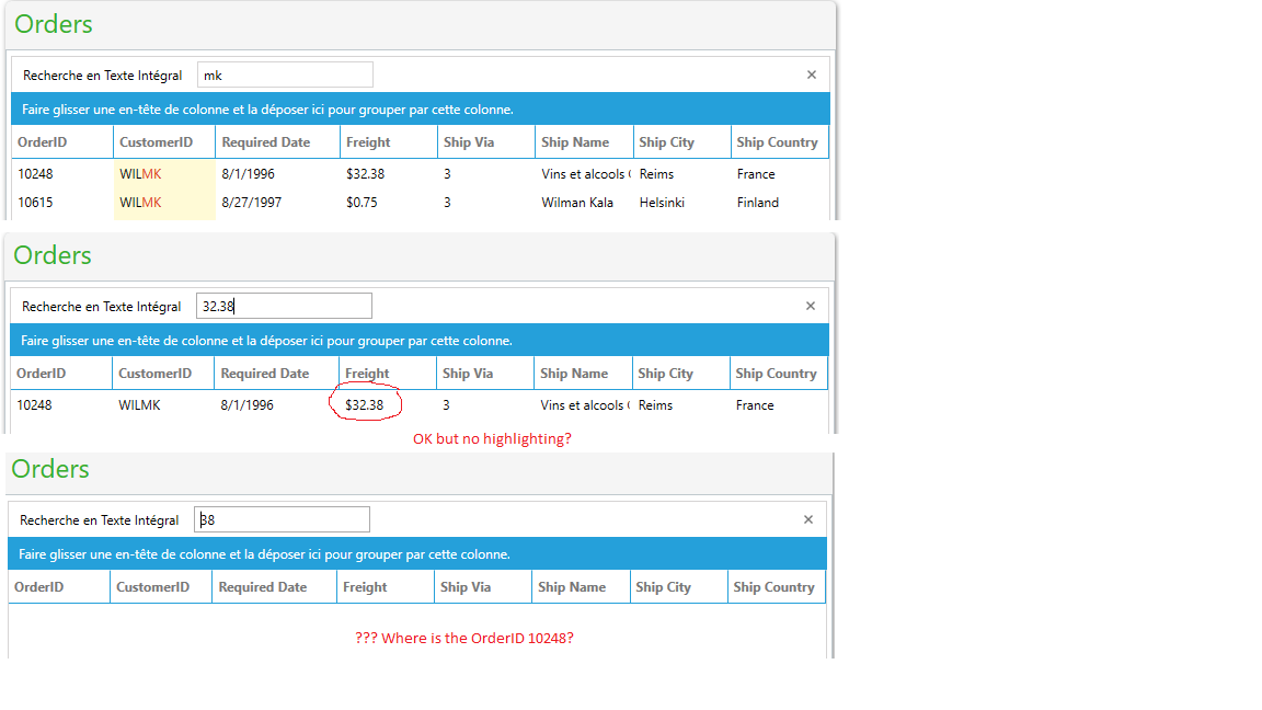 As for the number being filtered but not highlighted, it is due to the StringFormat that is applied to that column. I suggest you check the "Custom Highlight Column" demo from our SDK Samples Browser. Such custom column is a workaround you can use and add additional elements in a certain column.