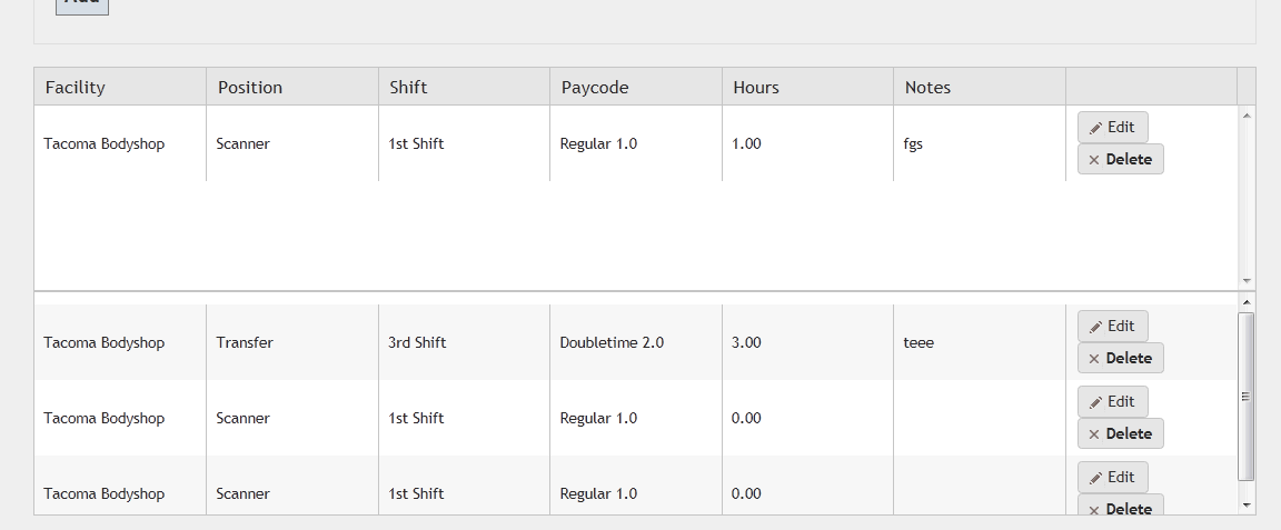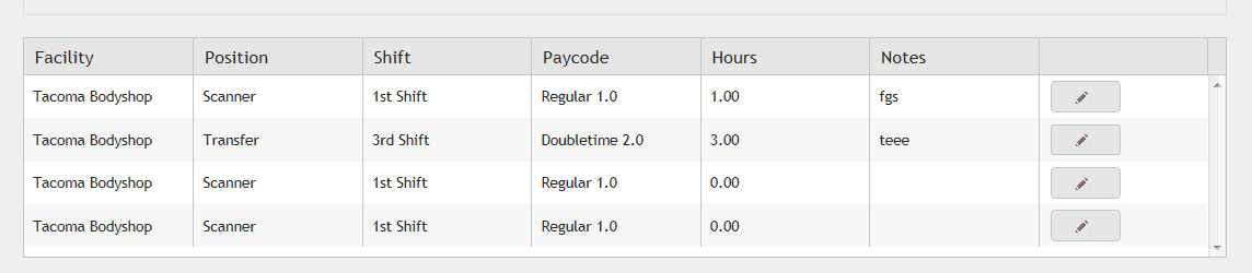 @(Html.Kendo().Grid<TimeAndAttendance.Models.DaysActivityViewModel>(Model.DayActivities) .Name("DaysActivities") .Columns(columns => { columns.Bound(da => da.Facility); columns.Bound(da => da.Position); columns.Bound(da => da.Shift); columns.Bound(da => da.Paycode); columns.Bound(da => da.Hours); columns.Bound(da => da.Notes); columns.Command(command => { command.Edit().Text(""); }); }) .Scrollable() .HtmlAttributes(new { style = "height:200px;" }) .DataSource(dataSource => dataSource .Server() .Update(update => update.Action("Edit", "IndividualTimeEntry")) .Destroy(destroy => destroy.Action("Delete", "IndividualTimeEntry")) .Model(model => model.Id(da => da.ID)) ) )