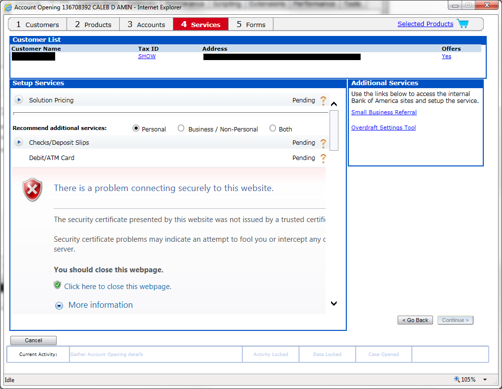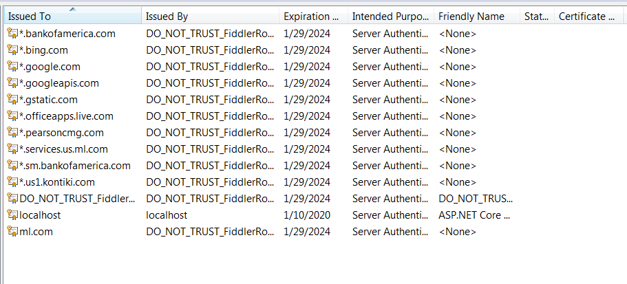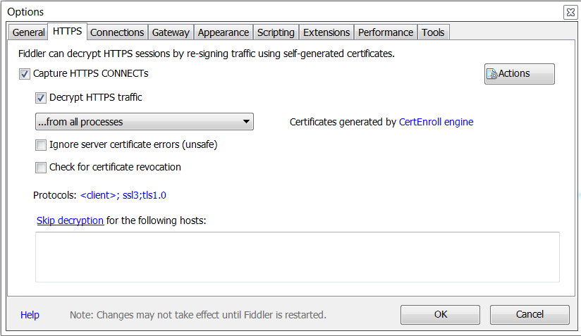 We have a web based application that renders inside an iFrame. When using Fiddler and decrypting HTTPS, there is one iFrame that generates the message "The security certificate presented by this website was not issued by a trusted certificate authority". If we uncheck the decrypt option or use the application without Fiddler running we have no errors. Looking at the URL it is trying to browse to a website that has a Fiddler DO_NOT_TRUST certificate in the user personal certificate repository. I have clicked on the Actions button on the HTTPS tab and chosen the "Trust Root Certificate" option but that made no difference. Any ideas why this one site would reject the Fiddler certificate?