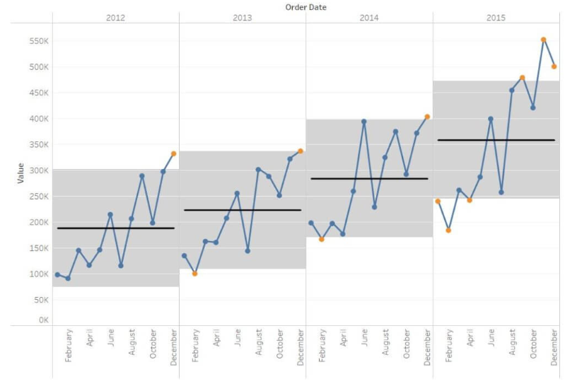 For example, lets say I select the count of product orders for every month over a 4 year timespan (2012-2015). With that selection, I will have 48 points of data displayed on my line chart. As a user, I would like to view how our order numbers compare on a year-by-year basis, while still seeing the order counts for the specific months. I select an option that specifies Segment = Year. My resulting chart should look like the attached image.