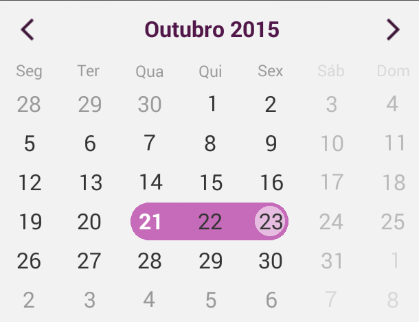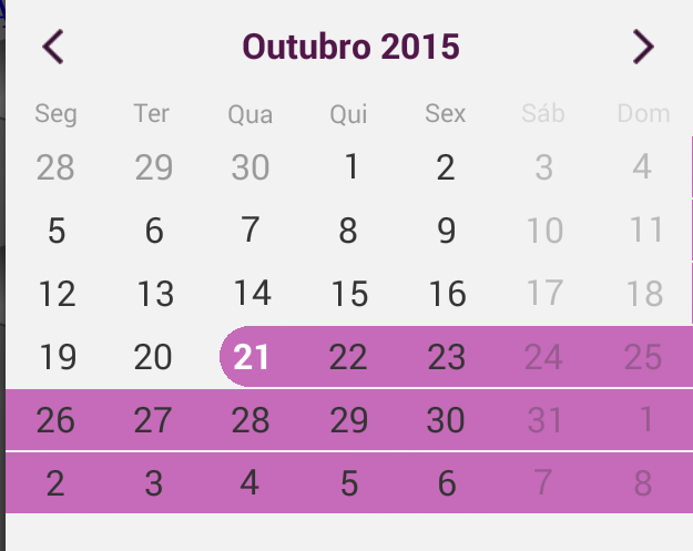 private void selected30Dates(long start) { Calendar calendar = Calendar.getInstance(); calendar.setTimeInMillis(start); calendar.add(Calendar.DATE, 30); long end = calendar.getTimeInMillis(); DateRange dateRange = new DateRange(start, end); calendarView.setSelectedRange(dateRange);}Now what's left is to call this method when a cell is clicked: