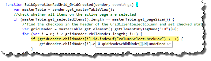 gridHeader.childNodes[i].id is null so it fails on ".indexOf". function BulkOperationRadGrid_GridCreated(sender, eventArgs) { var masterTable = sender.get_masterTableView(); //check whether all items on the active page are selected if (masterTable.get_selectedItems().length == masterTable.get_pageSize()) { /*find the checkbox in the header of the GridClientSelectColumn and set checked state for it - will work with AllowMultiRowSelection = true only!*/ var gridHeader = masterTable.get_element().getElementsByTagName("TH")[0]; for (var i = 0; i < gridHeader.childNodes.length; i++) { if (gridHeader.childNodes[i].id.indexOf("columnSelectCheckBox") > -1) { gridHeader.childNodes[i].checked = "true"; } } }