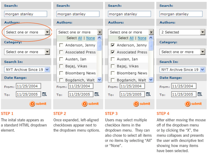 <ItemTemplate> <asp:CheckBox runat="server" ID="chk1"/> <asp:Label runat="server" ID="lbllist" AssociatedControlID="chk1" Text='<%# Eval("ComputerName") %>'></asp:Label> </ItemTemplate>I further need to implement a couple of linkbuttons in a single row at the top that will allow the user to select all or select none. Finally, the alternating grid lines would be a "nice-to-have". I've included a screenshot of the standards that I need to meet. Step two in that graphic is about where I need to be when the user drops down the combo.