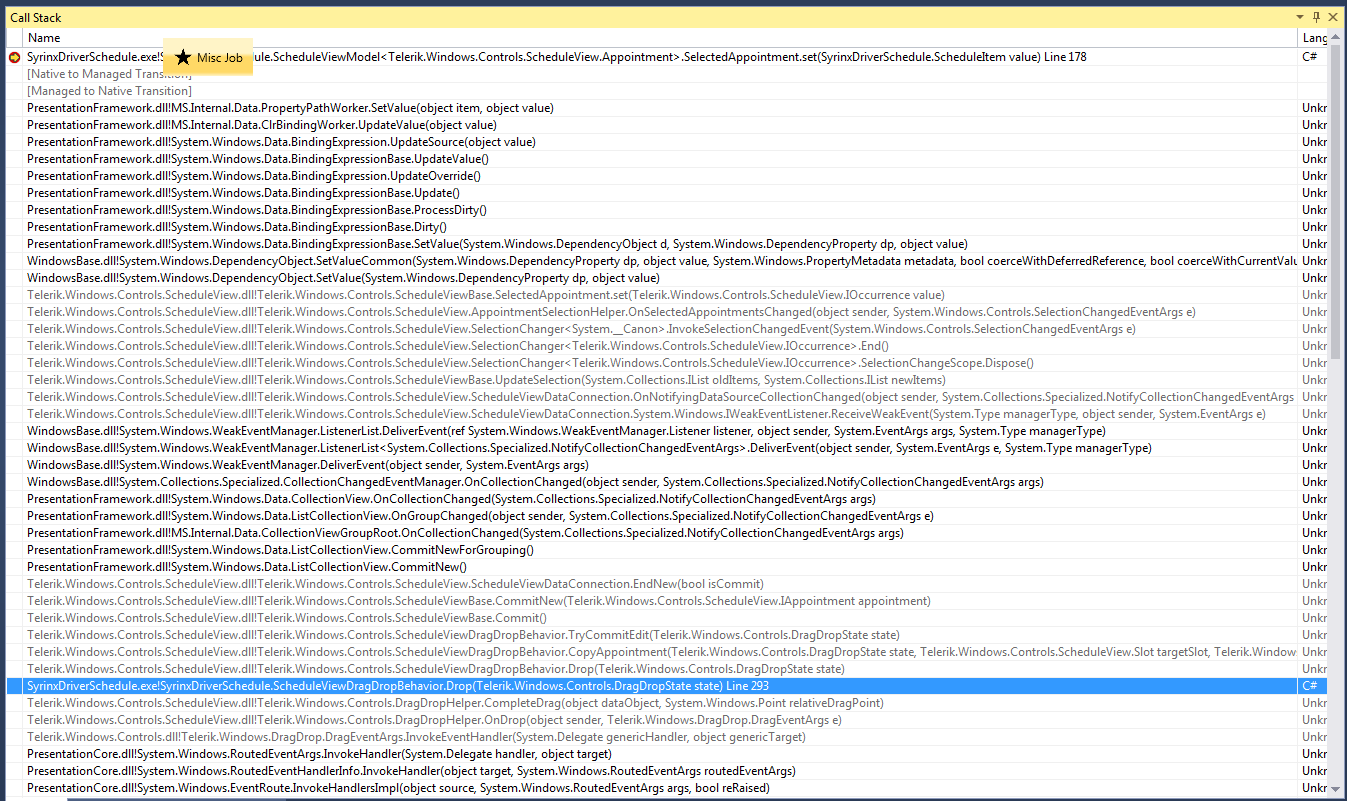 When the user drags one of the stackpanels onto the scheduleview, I've got some custom dragdropbehaviour going on, but at the end of the Drop method, it always calls base.Drop() and this is where the weird behaviour comes in, when I'm dragging a trip, it works perfectly and the trip is selected afterwards, but when I drag a misc job, it fires off the SelectedAppointment method with a null value which makes nothing selected afterwards.