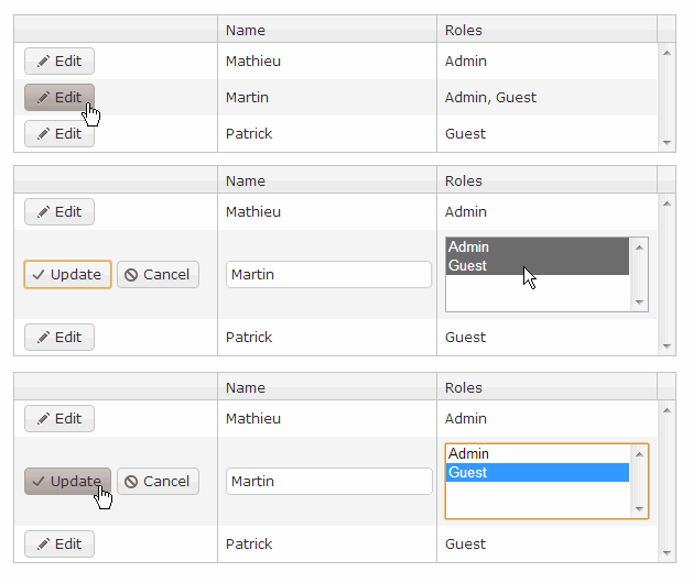 editor: "<select id='RoleIds' name='RoleIds' data-val='true' data-bind='value: RoleIds' multiple style='width:100%'><option value='1'>Admin</option><option value='2'>Guest</option></select>"