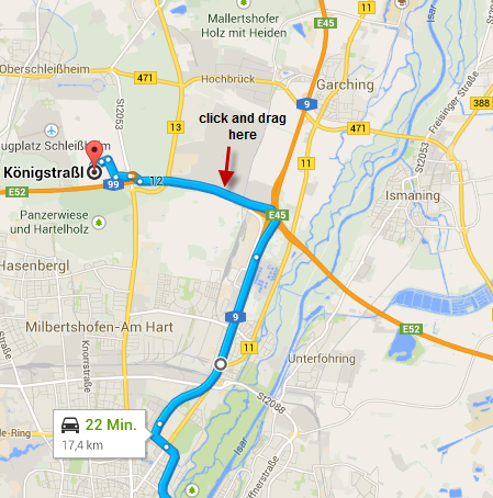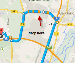 You know google maps, if you have created a route then you will see the polyline of the route in the map. Now you could click everywhere on the polyline and drag the way to another place. (See startdrag.png and drop.png)