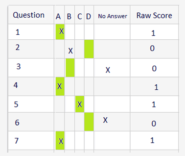 for Question 1 ,A is selected so if that's the correct answer then "Raw score" column has to be set to 1