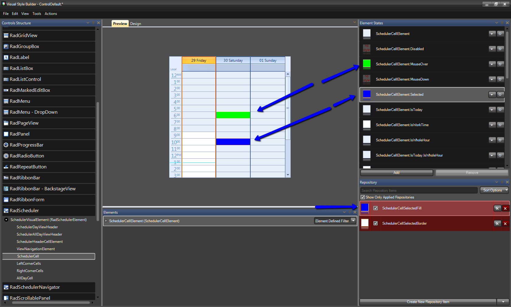 You can change the color of the cell when it is hovered or selected by modifying the theme that you are using. You can achieve this by changing the repository items, assigned to the SchedulerCellElement.MouseOver and SchedulerCellElement.Selected states. Please refer to the attached image.