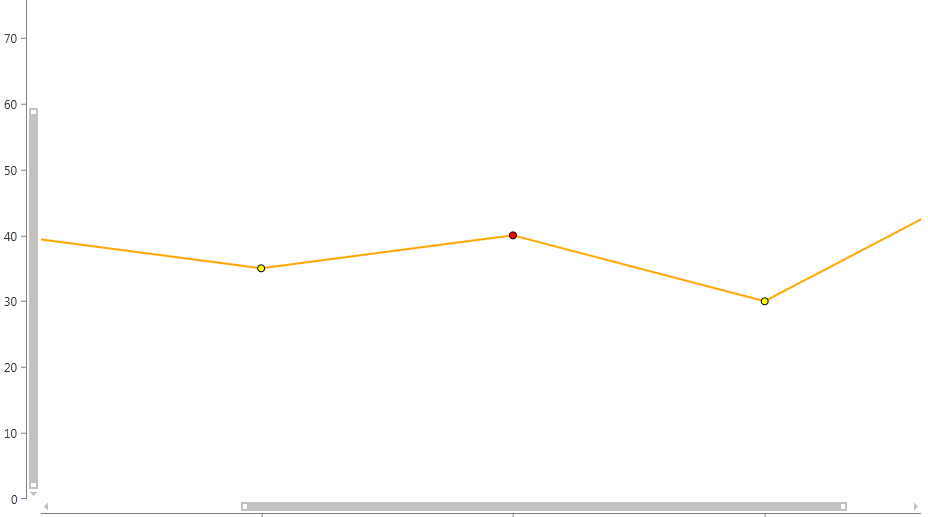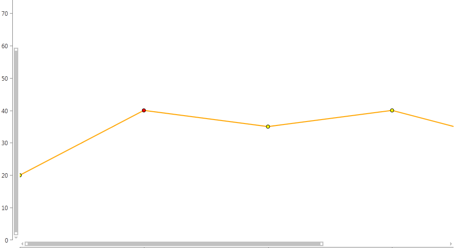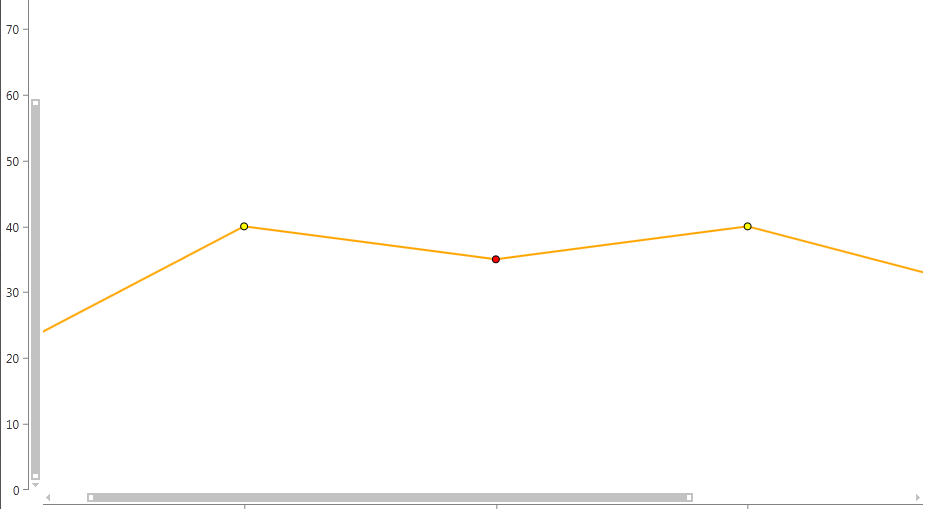 private void ChartSelectionBehavior_SelectionChanged_1(object sender, ChartSelectionChangedEventArgs e) { //Handle selection of the current point if (e.AddedPoints.Count > 0) { var addedPoint = e.AddedPoints[0]; var series = addedPoint.Presenter as LineSeries; //Get the Content Presenter of the series var pointPresenter = series.ChildrenOfType<ContentPresenter>(). Where(cp => cp.Tag == addedPoint).FirstOrDefault(); var ellipseElement = pointPresenter. ChildrenOfType<Ellipse>().FirstOrDefault(); //Do whatever you want with it :) ellipseElement.Fill = new SolidColorBrush(Colors.Red); } //Handle de-selection of the current point if (e.RemovedPoints.Count > 0) { var removedPoint = e.RemovedPoints[0]; var series = removedPoint.Presenter as LineSeries; var pointPresenter = series. ChildrenOfType<ContentPresenter>(). Where(cp => cp.Tag == removedPoint).FirstOrDefault(); var ellipseElement = pointPresenter. ChildrenOfType<Ellipse>().FirstOrDefault(); //Do whatever you want with it :) ellipseElement.Fill = new SolidColorBrush(Colors.Yellow); } }I've attached a couple of screenshots to make it clearer. The selected point shouldn't move - do you know why this is happening?