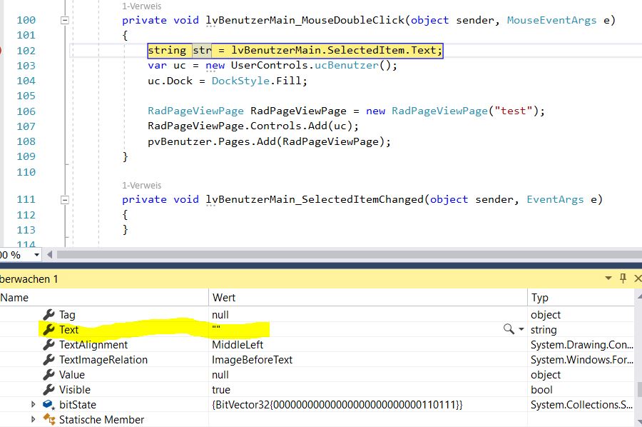 After selecting Items, the "Text" property of CurrentItem, SelectedItem or SelectedItems[0] is always empty. I tried also to get the Text by "lv.Items[lv.SelectedIndex].Text", but where is also the text property empty. But the SelectedIndex is correct.