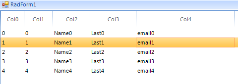 public RadForm1(){ InitializeComponent(); this.radListView1.ViewType = ListViewType.DetailsView; for (int i = 0; i < 5; i++) { this.radListView1.Columns.Add("Col" + i); } List<User> ListUsers = new List<User>(); for (int i = 0; i < 5; i++) { ListUsers.Add(new User(i,i,"Name" + i,"Last" + i,"email" + i)); } foreach (var User in ListUsers) { ListViewDataItem ListViewDataItem = new ListViewDataItem(); this.radListView1.Items.Add(ListViewDataItem); ListViewDataItem[0] = User.ID.ToString(); ListViewDataItem[1] = User.BenutzerID; ListViewDataItem[2] = User.Nachname; ListViewDataItem[3] = User.Vorname; ListViewDataItem[4] = User.EMailAdresse; }}public class User{ public int ID { get; set; } public int BenutzerID { get; set; } public string Nachname { get; set; } public string Vorname { get; set; } public string EMailAdresse { get; set; } public User(int iD, int benutzerID, string nachname, string vorname, string eMailAdresse) { this.ID = iD; this.BenutzerID = benutzerID; this.Nachname = nachname; this.Vorname = vorname; this.EMailAdresse = eMailAdresse; }}I hope this information helps.