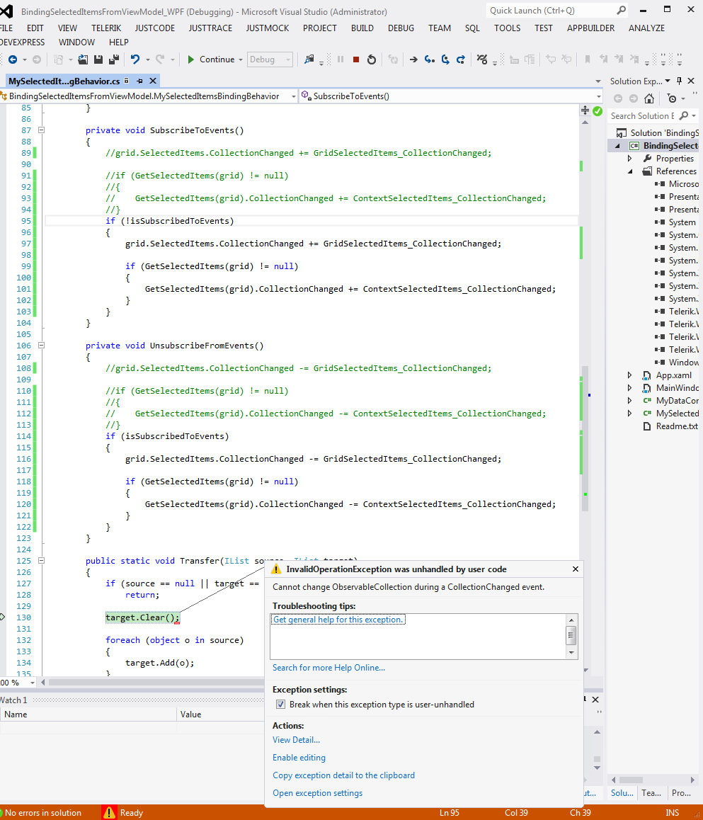 For example, this was reported by another user: I used the solution suggested in the last comment by Vlad from github, it worked fine, but sometimes I am getting the error "cannot change observablecollection during a collectionchanged event". I also get this error.