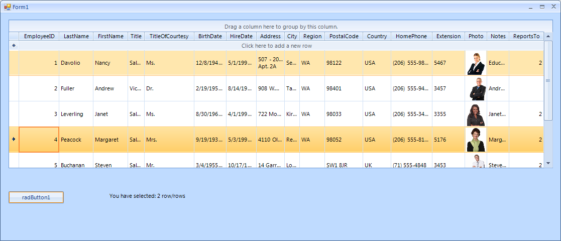 When the user selects a single row and clicks 'OK', the radgridview.selectedrows property returns a value of nothing. When the user selects multiple rows and clicks 'OK', the selectedrows property returns all selected rows except the the last selected row.
