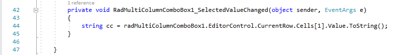 >TelerikWinFormsApp8.exe!TelerikWinFormsApp8.RadForm1.RadMultiColumnComboBox1_SelectedValueChanged(object sender, System.EventArgs e) Line 44C#