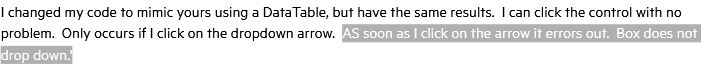 I changed my code to mimic yours using a DataTable, but have the same results. I can click the control with no problem. Only occurs if I click on the dropdown arrow. AS soon as I click on the arrow it errors out. Box does not drop down.'