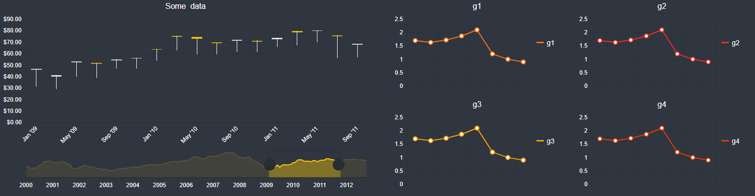 01.<div class="col-xs-6">02. @(Html.Kendo().Chart().Theme("sass")03. .Name("lines1")04. .Title("g1")05. .Series(s =>06. {07. s.Line(new List<double>());08. s.Line(new List<double> {1.7, 1.63, 1.72, 1.87, 2.1, 1.2, 1, 0.9}).Name("g1");09. })10. .HtmlAttributes(new { style = "height:200px;" })11. )12.</div>13.<div class="col-xs-6">14. @(Html.Kendo().Chart().Theme("sass")15. .Name("lines2")16. .Title("g2")17. .Series(s =>18. {19. s.Line(new List<double>());20. s.Line(new List<double>());21. s.Line(new List<double> {1.7, 1.63, 1.72, 1.87, 2.1, 1.2, 1, 0.9}).Name("g2");22. })23. .HtmlAttributes(new { style = "height:200px;" })24. )25.</div>26.<div class="col-xs-6">27. @(Html.Kendo().Chart().Theme("sass")28. .Name("lines3")29. .Title("g3")30. .Series(s =>31. {32. s.Line(new List<double>());33. s.Line(new List<double>());34. s.Line(new List<double>());35. s.Line(new List<double> {1.7, 1.63, 1.72, 1.87, 2.1, 1.2, 1, 0.9}).Name("g3");36. })37. .HtmlAttributes(new {style = "height:200px;"})38. )39.</div>40.<div class="col-xs-6">41. @(Html.Kendo().Chart().Theme("sass")42. .Name("lines4")43. .Title("g4")44. .Series(s =>45. {46. s.Line(new List<double>());47. s.Line(new List<double>());48. s.Line(new List<double>());49. s.Line(new List<double>());50. s.Line(new List<double> {1.7, 1.63, 1.72, 1.87, 2.1, 1.2, 1, 0.9}).Name("g4");51. } )52. .HtmlAttributes(new { style = "height:200px;" })53. )54.</div>