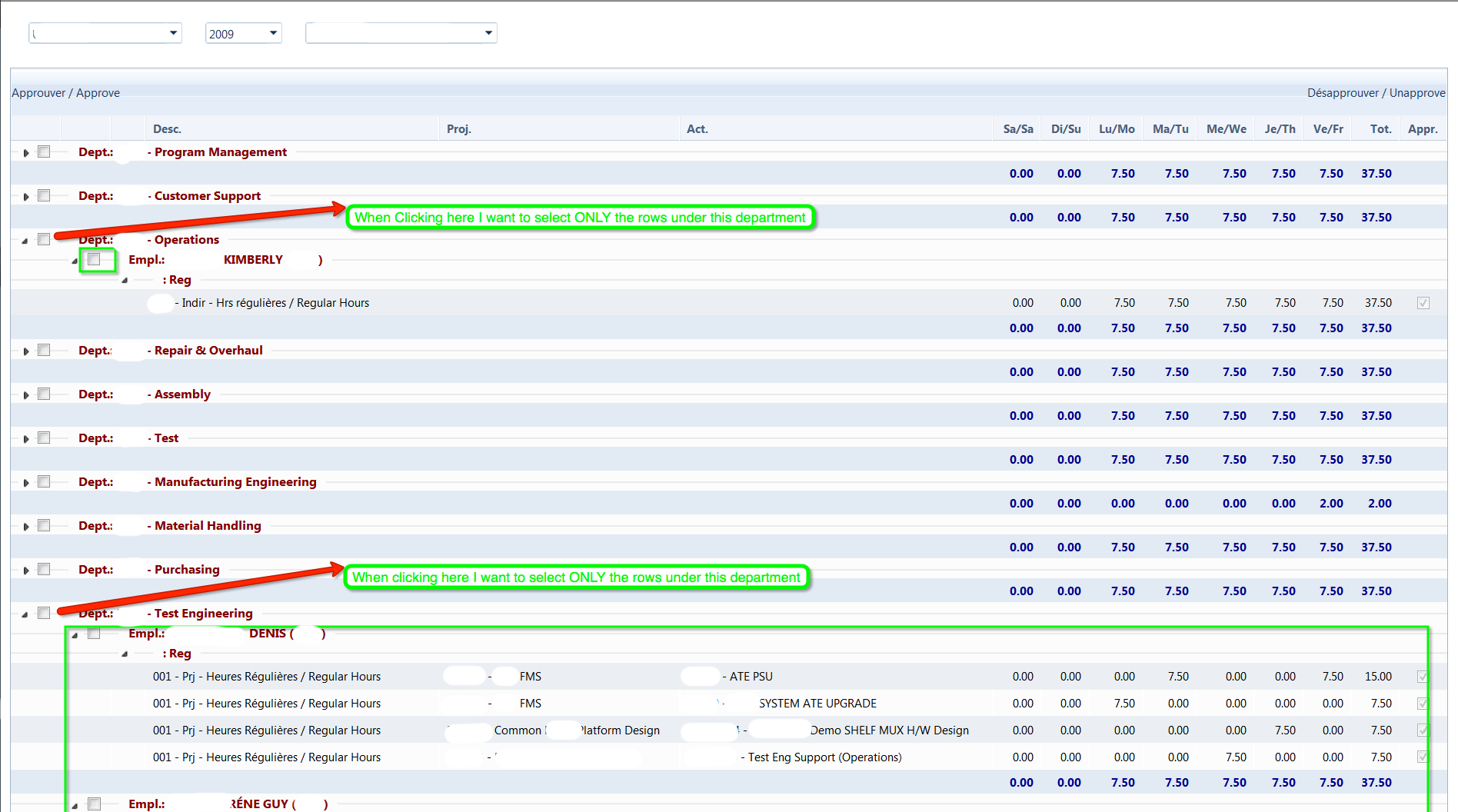 When I check the check box in a parent row, the checkboxes in child records and corresponding grand child records are checked programmatically with the following code.