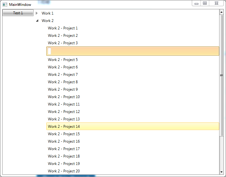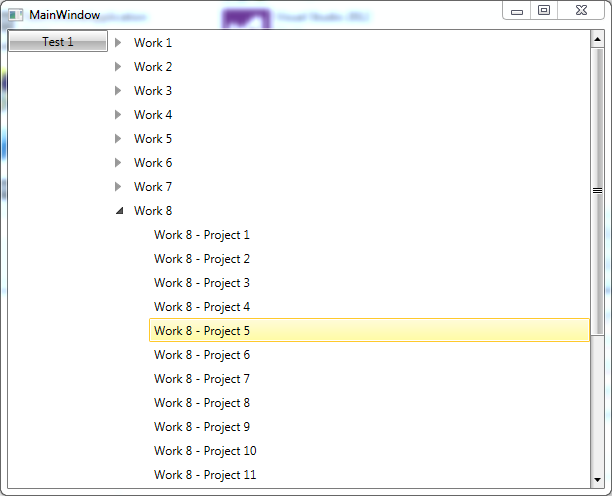 using System;using System.Collections.Generic;using System.Collections.ObjectModel;namespace TelerikTreeViewApp{ public class MyData { public ObservableCollection<Work> Works { get; set; } public ObservableCollection<Project> Projects { get; set; } public MyData() { InitializeWorks(); Projects = new ObservableCollection<Project>(); } public void InitializeWorks() { String workTitle = String.Empty; Works = new ObservableCollection<Work>(); workTitle = "Work 1"; Works.Add(new Work(workTitle) { Projects = new List<Project>(new Project[] { new Project(workTitle + " - Project 1") , new Project(workTitle + " - Project 2") , new Project(workTitle + " - Project 3") , new Project(workTitle + " - Project 4") , new Project(workTitle + " - Project 5") , new Project(workTitle + " - Project 6") , new Project(workTitle + " - Project 7") , new Project(workTitle + " - Project 8") , new Project(workTitle + " - Project 9") , new Project(workTitle + " - Project 10"), new Project(workTitle + " - Project 11") , new Project(workTitle + " - Project 12") , new Project(workTitle + " - Project 13") , new Project(workTitle + " - Project 14") , new Project(workTitle + " - Project 15") , new Project(workTitle + " - Project 16") , new Project(workTitle + " - Project 17") , new Project(workTitle + " - Project 18") , new Project(workTitle + " - Project 19") , new Project(workTitle + " - Project 20") }) }); workTitle = "Work 2"; Works.Add(new Work(workTitle) { Projects = new List<Project>(new Project[] { new Project(workTitle + " - Project 1") , new Project(workTitle + " - Project 2") , new Project(workTitle + " - Project 3") , new Project(workTitle + " - Project 4") , new Project(workTitle + " - Project 5") , new Project(workTitle + " - Project 6") , new Project(workTitle + " - Project 7") , new Project(workTitle + " - Project 8") , new Project(workTitle + " - Project 9") , new Project(workTitle + " - Project 10"), new Project(workTitle + " - Project 11") , new Project(workTitle + " - Project 12") , new Project(workTitle + " - Project 13") , new Project(workTitle + " - Project 14") , new Project(workTitle + " - Project 15") , new Project(workTitle + " - Project 16") , new Project(workTitle + " - Project 17") , new Project(workTitle + " - Project 18") , new Project(workTitle + " - Project 19") , new Project(workTitle + " - Project 20") }) }); workTitle = "Work 3"; Works.Add(new Work(workTitle) { Projects = new List<Project>(new Project[] { new Project(workTitle + " - Project 1") , new Project(workTitle + " - Project 2") , new Project(workTitle + " - Project 3") , new Project(workTitle + " - Project 4") , new Project(workTitle + " - Project 5") , new Project(workTitle + " - Project 6") , new Project(workTitle + " - Project 7") , new Project(workTitle + " - Project 8") , new Project(workTitle + " - Project 9") , new Project(workTitle + " - Project 10"), new Project(workTitle + " - Project 11") , new Project(workTitle + " - Project 12") , new Project(workTitle + " - Project 13") , new Project(workTitle + " - Project 14") , new Project(workTitle + " - Project 15") , new Project(workTitle + " - Project 16") , new Project(workTitle + " - Project 17") , new Project(workTitle + " - Project 18") , new Project(workTitle + " - Project 19") , new Project(workTitle + " - Project 20") }) }); workTitle = "Work 4"; Works.Add(new Work(workTitle) { Projects = new List<Project>(new Project[] { new Project(workTitle + " - Project 1") , new Project(workTitle + " - Project 2") , new Project(workTitle + " - Project 3") , new Project(workTitle + " - Project 4") , new Project(workTitle + " - Project 5") , new Project(workTitle + " - Project 6") , new Project(workTitle + " - Project 7") , new Project(workTitle + " - Project 8") , new Project(workTitle + " - Project 9") , new Project(workTitle + " - Project 10"), new Project(workTitle + " - Project 11") , new Project(workTitle + " - Project 12") , new Project(workTitle + " - Project 13") , new Project(workTitle + " - Project 14") , new Project(workTitle + " - Project 15") , new Project(workTitle + " - Project 16") , new Project(workTitle + " - Project 17") , new Project(workTitle + " - Project 18") , new Project(workTitle + " - Project 19") , new Project(workTitle + " - Project 20") }) }); workTitle = "Work 5"; Works.Add(new Work(workTitle) { Projects = new List<Project>(new Project[] { new Project(workTitle + " - Project 1") , new Project(workTitle + " - Project 2") , new Project(workTitle + " - Project 3") , new Project(workTitle + " - Project 4") , new Project(workTitle + " - Project 5") , new Project(workTitle + " - Project 6") , new Project(workTitle + " - Project 7") , new Project(workTitle + " - Project 8") , new Project(workTitle + " - Project 9") , new Project(workTitle + " - Project 10"), new Project(workTitle + " - Project 11") , new Project(workTitle + " - Project 12") , new Project(workTitle + " - Project 13") , new Project(workTitle + " - Project 14") , new Project(workTitle + " - Project 15") , new Project(workTitle + " - Project 16") , new Project(workTitle + " - Project 17") , new Project(workTitle + " - Project 18") , new Project(workTitle + " - Project 19") , new Project(workTitle + " - Project 20") }) }); workTitle = "Work 6"; Works.Add(new Work(workTitle) { Projects = new List<Project>(new Project[] { new Project(workTitle + " - Project 1") , new Project(workTitle + " - Project 2") , new Project(workTitle + " - Project 3") , new Project(workTitle + " - Project 4") , new Project(workTitle + " - Project 5") , new Project(workTitle + " - Project 6") , new Project(workTitle + " - Project 7") , new Project(workTitle + " - Project 8") , new Project(workTitle + " - Project 9") , new Project(workTitle + " - Project 10"), new Project(workTitle + " - Project 11") , new Project(workTitle + " - Project 12") , new Project(workTitle + " - Project 13") , new Project(workTitle + " - Project 14") , new Project(workTitle + " - Project 15") , new Project(workTitle + " - Project 16") , new Projec