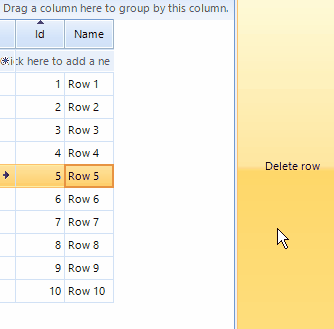 public partial class Form : System.Windows.Forms.Form { public Form() { InitializeComponent(); } private void Form_Load(object sender, EventArgs e) { RadGridView grid = new RadGridView(); grid.Dock = DockStyle.Left; grid.SortDescriptors.Add("Id", ListSortDirection.Ascending); grid.SelectionMode = GridViewSelectionMode.FullRowSelect; BindingList <X> bindingList = new BindingList<X>(); bindingList.Add(new X() { Id = 1, Name = "Row 1" }); bindingList.Add(new X() { Id = 5, Name = "Row 5" }); bindingList.Add(new X() { Id = 3, Name = "Row 3" }); bindingList.Add(new X() { Id = 4, Name = "Row 4" }); bindingList.Add(new X() { Id = 2, Name = "Row 2" }); bindingList.Add(new X() { Id = 6, Name = "Row 6" }); bindingList.Add(new X() { Id = 7, Name = "Row 7" }); bindingList.Add(new X() { Id = 8, Name = "Row 8" }); bindingList.Add(new X() { Id = 9, Name = "Row 9" }); bindingList.Add(new X() { Id = 10, Name = "Row 10" }); Controls.Add(grid); grid.DataSource = bindingList; RadButton radButton = new RadButton(); radButton.Text = "Delete row"; radButton.Dock = DockStyle.Right; radButton.Click += delegate { var selected = (X)grid.CurrentRow.DataBoundItem; bindingList.Remove(selected); }; Controls.Add(radButton); } } public class X { public Int32 Id { get; set; } public String Name { get; set; } }