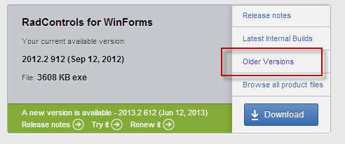 My subscription expired last year (June 23 2012) and in the year I had the subscription I did not download any updates. Now if I go to the account I can't get any updates that were released in the year of my subscription. I can only get version 2011.1.512- that even older that what I have... It looks like for other products than RadControls for WebForms (JustCode, WinForms...) there are options to get the 2012 version but not for what I'm interested in :( Is there a way to get the Q1 2012 version since at that time I was subscribed?