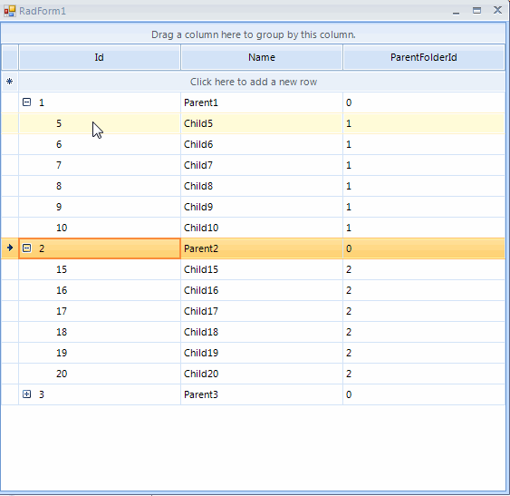 The PreviewDragOver event allows you to control on what targets the row being dragged can be dropped on. RadDragOverEventArgs gives you access to the dragged and the target item. It is necessary to set the RadDragOverEventArgs.CanDrop argument to true or false considering whether the drop operation is allowed or not. This will affect he cursor respectively.