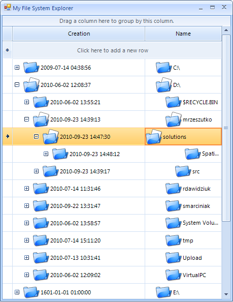 using System;using System.Collections.Generic;using System.Drawing;using System.Windows.Forms;using Telerik.WinControls;using Telerik.WinControls.UI;using System.IO;namespace TelerikRadControlsWinFormsPrototype{ public partial class MyFileSystemExplorer : Telerik.WinControls.UI.RadForm { private int idCounter = 0; public MyFileSystemExplorer() { InitializeComponent(); } private void Form1_Load(object sender, EventArgs e) { // grid initialize this.radGridView1.CellFormatting += new CellFormattingEventHandler(radGridView1_CellFormatting); this.radGridView1.ChildViewExpanded += new ChildViewExpandedEventHandler(radGridView1_ChildViewExpanded); this.radGridView1.Relations.AddSelfReference(this.radGridView1.MasterTemplate, "ID", "ParentID"); this.radGridView1.ImageList = this.imageList1; this.radGridView1.TableElement.RowHeight = 35; // colums GridViewDataColumn idCol = new GridViewDecimalColumn(); idCol.DataType = typeof(int); idCol.Name = "ID"; idCol.ReadOnly = true; idCol.IsVisible = false; this.radGridView1.Columns.Add(idCol); GridViewDataColumn parentIdCol = new GridViewDecimalColumn(); parentIdCol.DataType = typeof(int); parentIdCol.Name = "ParentID"; parentIdCol.ReadOnly = true; parentIdCol.IsVisible = false; this.radGridView1.Columns.Add(parentIdCol); GridViewDataColumn nameCol = new GridViewTextBoxColumn(); nameCol.DataType = typeof(string); nameCol.Name = "Name"; nameCol.HeaderText = "Name"; nameCol.ReadOnly = true; this.radGridView1.Columns.Add(nameCol); GridViewDataColumn modiffCol = new GridViewTextBoxColumn(); modiffCol.DataType = typeof(DateTime); modiffCol.Name = "Creation"; modiffCol.HeaderText = "Creation"; modiffCol.ReadOnly = true; this.radGridView1.Columns.Add(modiffCol); // root rows List<FileSystemInfoWrp> drivesInfo = new List<FileSystemInfoWrp>(); foreach (DriveInfo di in DriveInfo.GetDrives()) { drivesInfo.Add(new FileSystemInfoWrp(this.idCounter++, di.RootDirectory)); } this.Add(null, drivesInfo.ToArray()); } void radGridView1_ChildViewExpanded(object sender, ChildViewExpandedEventArgs e) { if (e.IsExpanded) { FileSystemInfoWrp parent = (FileSystemInfoWrp)e.ParentRow.Tag; // adding in begin/end update section invokes NullReferenceException, why ? //this.radGridView1.BeginUpdate(); try { this.Add(parent, this.GetFileSystemElements(parent)); } finally { //this.radGridView1.EndUpdate(); } this.radGridView1.GridNavigator.SelectRow(e.ParentRow); } else { // remove child nodes, always read files from hdd foreach(GridViewRowInfo gvri in e.ParentRow.ChildRows) { this.radGridView1.Rows.Remove(gvri); } } } void radGridView1_CellFormatting(object sender, CellFormattingEventArgs e) { GridDataCellElement cell = e.CellElement as GridDataCellElement; if (cell != null && cell.ExpanderItem != null) { cell.ImageAlignment = ContentAlignment.MiddleLeft; cell.ExpanderItem.Alignment = ContentAlignment.MiddleLeft; if (((FileSystemInfoWrp)e.Row.Tag).ElementInfo is DirectoryInfo) { if (e.Row.IsExpanded) { cell.Image = this.imageList1.Images[1]; } else cell.Image = this.imageList1.Images[0]; cell.ExpanderItem.Visibility = ElementVisibility.Visible; } else { cell.Image = this.imageList1.Images[2]; cell.ExpanderItem.Visibility = ElementVisibility.Hidden; } cell.TextImageRelation = TextImageRelation.ImageBeforeText; } } private FileSystemInfoWrp[] GetFileSystemElements(FileSystemInfoWrp root) { List<FileSystemInfoWrp> result = new List<FileSystemInfoWrp>(); if (root.ElementInfo is DirectoryInfo) { try { FileSystemInfo[] infos = ((DirectoryInfo)root.ElementInfo).GetFileSystemInfos(); foreach (FileSystemInfo fi in infos) { result.Add(new FileSystemInfoWrp(this.idCounter++, fi)); } } catch // omits io exception { } } return result.ToArray(); } private void Add(FileSystemInfoWrp parent, FileSystemInfoWrp[] fileInfos) { foreach (FileSystemInfoWrp fsiw in fileInfos) { GridViewRowInfo row = this.radGridView1.Rows.AddNew(); row.Cells["ID"].Value = fsiw.Id; if (parent != null) row.Cells["ParentID"].Value = parent.Id; row.Cells["Name"].Value = fsiw.ElementInfo.Name; row.Cells["Creation"].Value = fsiw.ElementInfo.CreationTime; row.Tag = fsiw; } } } public class FileSystemInfoWrp { public int Id { get; set; } public FileSystemInfo ElementInfo { get; set; } public FileSystemInfoWrp(int id, FileSystemInfo elementInfo) { this.Id = id; this.ElementInfo = elementInfo; } }}designer: