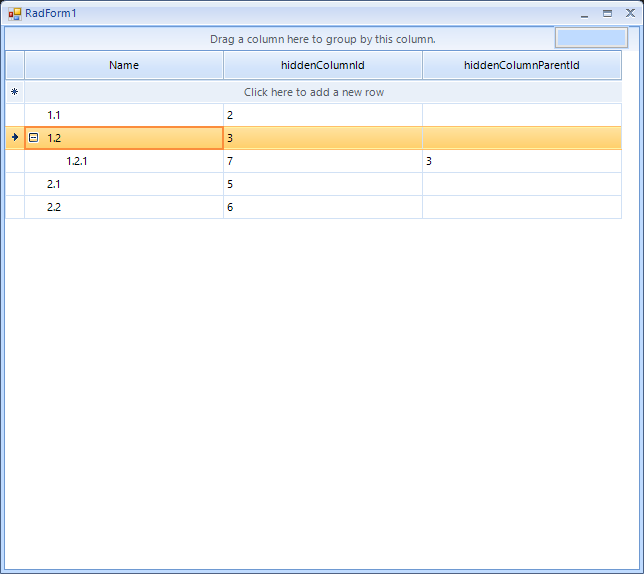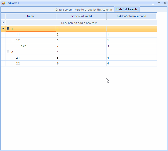 1.var col1 = new GridViewTextBoxColumn("hiddenColumnId", "Id");2.var col2 = new GridViewTextBoxColumn("hiddenColumnParentId", "ParentId");3.grid.MasterTemplate.Columns.Add(col1);4.grid.MasterTemplate.Columns.Add(col2);5.grid.Columns["hiddenColumnId"].IsVisible = false;6.grid.Columns["hiddenColumnParentId"].IsVisible = false;7.grid.Relations.AddSelfReference(grid.MasterTemplate, "hiddenColumnId", "hiddenColumnParentId");