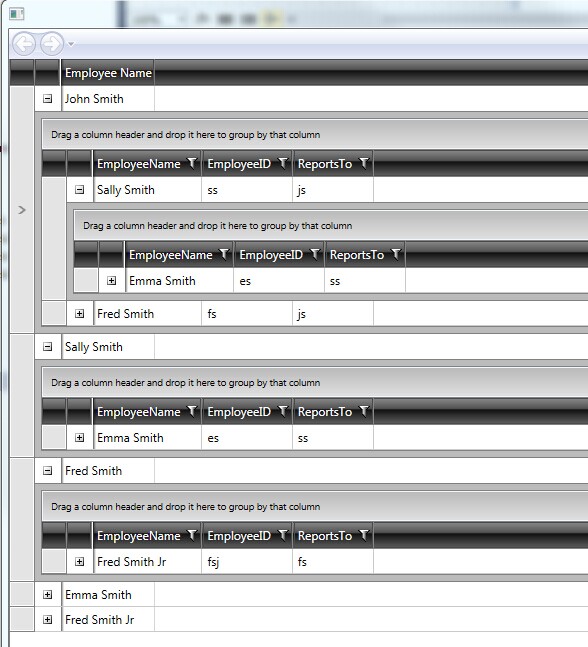 I have seen a old topic which talk about this, (see the link: http://www.telerik.com/forums/self-referencing-hierarchy-that-is-n-levels-deep#HN4SgZblU0eBamdGcvLWiQ) and I succeed to run this example, but there are always the children sector show in the first sector ("Sally Smith", "Fred Smith" should show only in the second level subsector and his father is "John Smith", "Emma Smith" should only show in the third level subsector and his father is "Sally Smith", see in the attach files to get more details). So I want to know how to fix this issue?