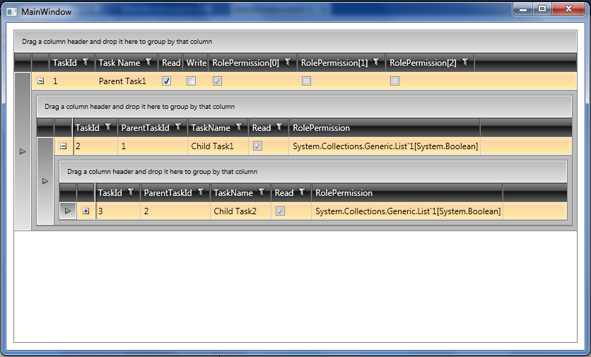 <telerik:RadGridView x:Name="RadGridView1" DataLoading="RadGridView1_DataLoading" RowLoaded="RadGridView1_RowLoaded" GridLinesVisibility="Horizontal" CanUserFreezeColumns="False" IsReadOnly="True" AutoGenerateColumns="False" Margin="10"> <telerik:RadGridView.Columns> <telerik:GridViewDataColumn DataMemberBinding="{Binding TaskId}" /> <telerik:GridViewDataColumn Header="Task Name" DataMemberBinding="{Binding TaskName}" /> <telerik:GridViewDataColumn Header="Read"> <telerik:GridViewColumn.CellTemplate> <DataTemplate> <CheckBox x:Name="checkBoxRead" IsChecked="{Binding Read}" /> </DataTemplate> </telerik:GridViewColumn.CellTemplate> </telerik:GridViewDataColumn> <telerik:GridViewDataColumn Header="Write"> <telerik:GridViewColumn.CellTemplate> <DataTemplate> <CheckBox x:Name="checkBoxWrite" IsChecked="{Binding Write}" /> </DataTemplate> </telerik:GridViewColumn.CellTemplate> </telerik:GridViewDataColumn> </telerik:RadGridView.Columns> <telerik:RadGridView.FilterDescriptors> <telerik:FilterDescriptor Member="ParentTaskId" Operator="IsEqualTo" Value="0"/> </telerik:RadGridView.FilterDescriptors> <telerik:RadGridView.ChildTableDefinitions> <telerik:GridViewTableDefinition> <telerik:GridViewTableDefinition.Relation > <telerik:TableRelation IsSelfReference="True" > <telerik:TableRelation.FieldNames> <telerik:FieldDescriptorNamePair ParentFieldDescriptorName="TaskId" ChildFieldDescriptorName="ParentTaskId" /> </telerik:TableRelation.FieldNames> </telerik:TableRelation> </telerik:GridViewTableDefinition.Relation> </telerik:GridViewTableDefinition> </telerik:RadGridView.ChildTableDefinitions> </telerik:RadGridView>I have a problem when I add dynamic columns columns are showing at rool level but does not get added at child node level. If you notice in the screenshot RolePermissions[0], RolePermissions[1], RolePermissions[2] are dynamic columns. I have attached the screenshot. Is there a simple way to fix it please suggest.