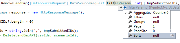 Now What Iam planning to do is Pass DataSourceRequest to controller along with some other parameters which are required for data pull from DataBase, once i get the data back from Database (which is all original data like 20,000-30,000 rows) i would apply the passed DataSourceRequest to the List which then gives me the filtered data (around 5000). Now i have filtered data in my controller and i can use their ids to do a bulk delete at a time.