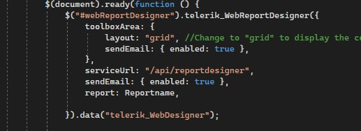 //if (!viewerOptions.sendEmail || !viewerOptions.sendEmail.enabled) { // var toolbarSendEmailItem = $("[data-selector='" + selector + "']").find("a[data-command='telerik_ReportViewer_toggleSendEmailDialog']").closest(".k-item "); // toolbarSendEmailItem.hide(); // return; //}3. In the page of the designer, reference the js file: