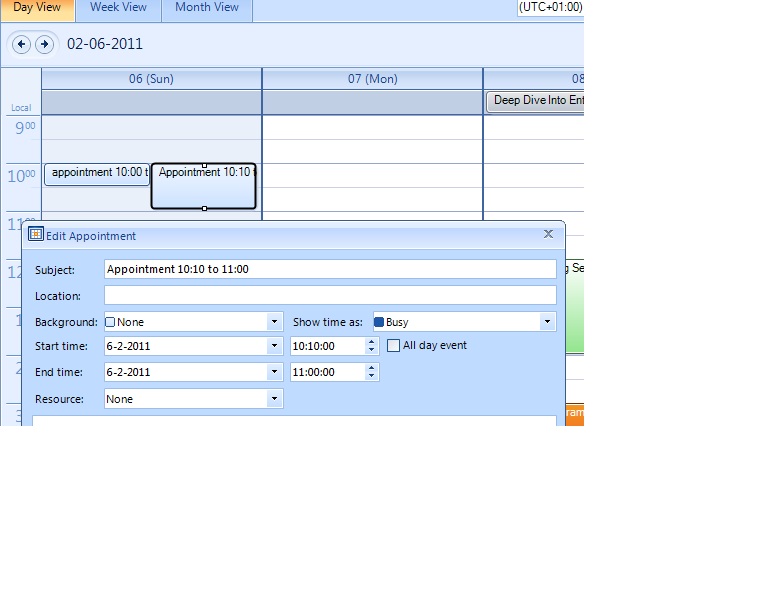 When I make an appointment in dayview with the RangeFactor set to five minutes. I can make 2 appointments, say 10:00-10:10 and 10:10-11:00. When I switch to weekview with the standard RangeFactor of 30 minutes these appointsments are placed side by side and the visual representation looks like 10:00-10:30 and 10:00 to 11:00. The timevalues are correct inside the dialog and database. The visual timescale is wrong, they should not overlap, but be placed on below one another. If I set the RangeFactor to 5 minutes I cannot see al the appoints in one screen.