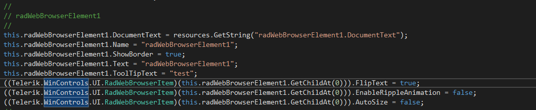 To make it easier, I added a sample at design time and set up the properties for the embedded web browser in the property designer, eg suppressing errors, disabling links etc. I planned to copy/paste these from the designer.cs file into my factory, but I can only see the properties associated to the RadWebBrowserElement itself in the designer.cs file.