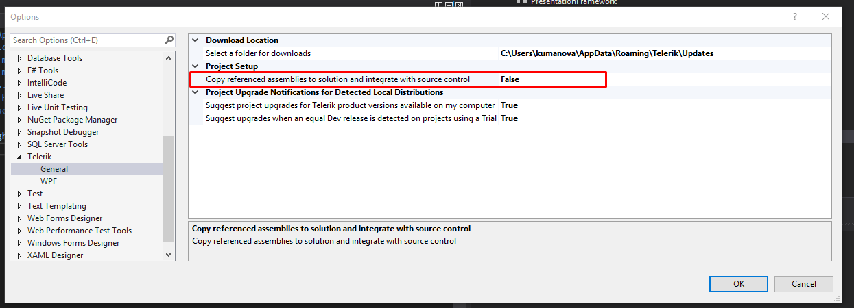 I also noticed that referenced binaries are copied in your solution. You can also disable this option easily and reference the assemblies from the installation folder. It can easily change through Visual Studio: Navigate to Extensions => Telerik => VSExtensions Options => In the dialog set the option 'Copy referenced assemblies to the solution and integrate with source control' to False (see the attached image).