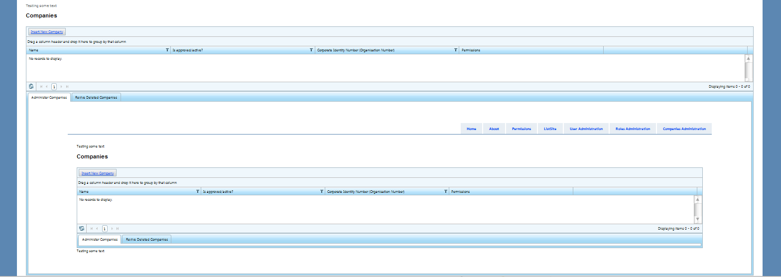 Unfortunately we now get the case where the content of the tab is displayed first, then the tabstrip component with the content again. I'll attach a screenshot to show the result. The grid is a partial view, produced by the Companies view. The code producing this is: