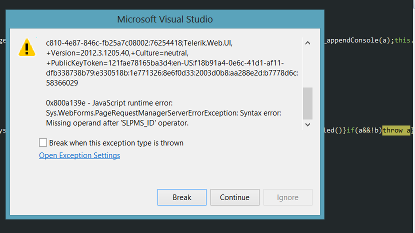 When I have a server-side error that would, normally, cause Visual Studio 2012 to pause debugging & highlight the offending line, instead it shows up as a JavaScript runtime error. Could you please tell me how to disable this. Thank you.