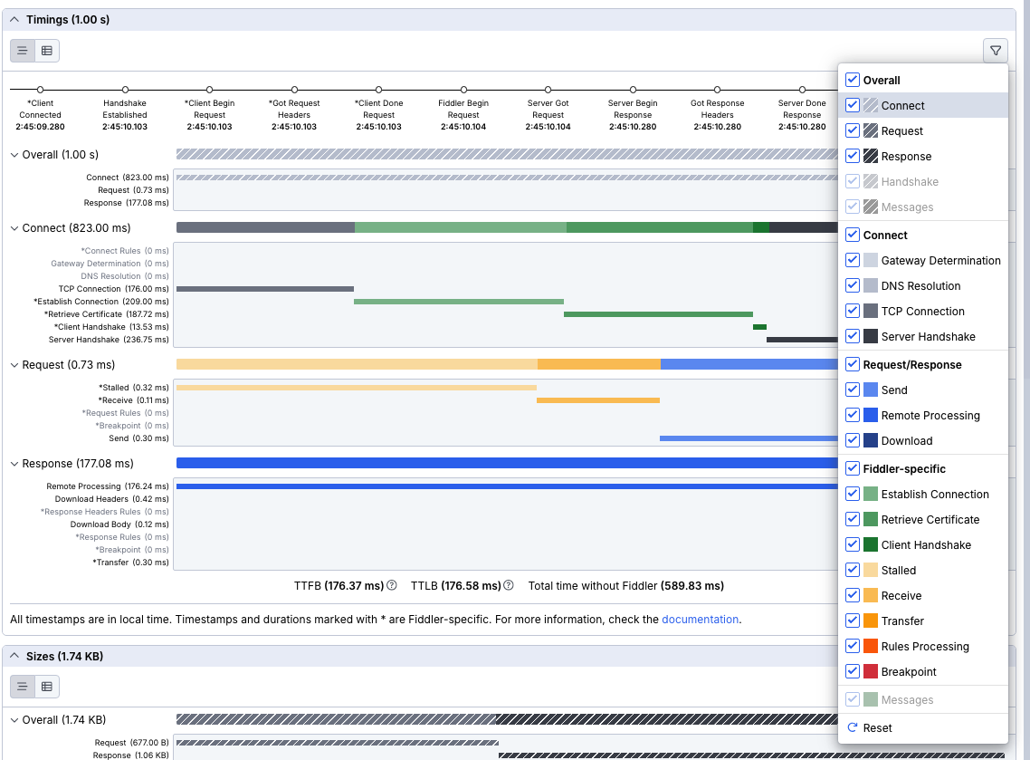 Hi there, I've used Fiddler occasionally for years, but am new to Fiddler Anywhere. I want to use Fiddler to accurately time page load times of my Dynamics 365 CRM system. I used to do this by filtering on the URL of my CRM system, clearing the traffic window, loading a page, clicking Ctrl+A in the traffic window to highlight all the sessions, and then reading off the total time from start to end (currently shown as the Max Duration figure in the Overview Window).
