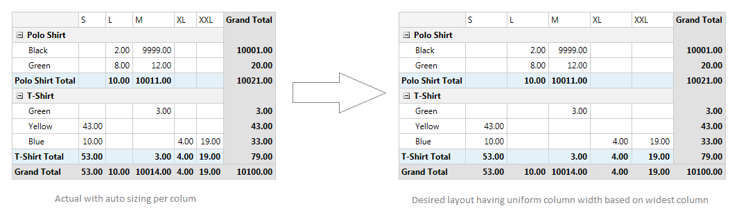 Can the column width be set on a per-column basis using a value converter? The suggested solution affects all columns including the totals columns. This results either in columns that are too wide, or a truncated totals column.