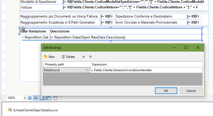 My report shows CustomerModel properties by "Fields.Propxxxx", I added a Table that I connected through binding DataSource of table using "Fields.Customer.ConditionsList", (I tested that a runtime, ConditionList is valued).