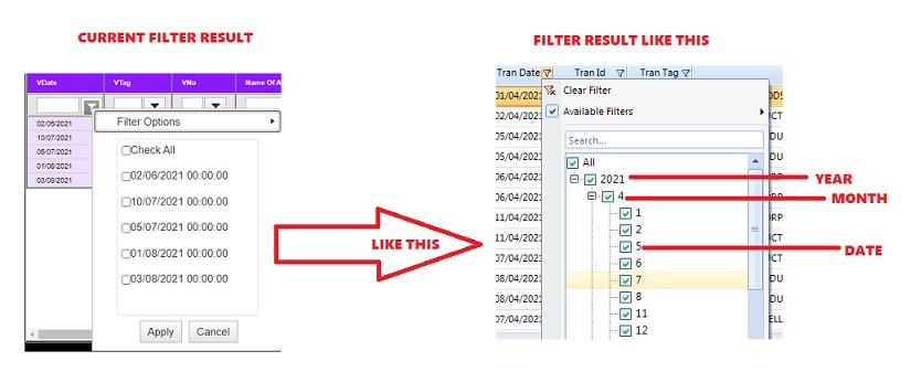 The functionality seen on the screenshot is beyond the Grid's built-in functionalities. You can, however, try to create a Filter Template with a TreeView component listing the Years, Months, and Days similar to the option in the screenshot.