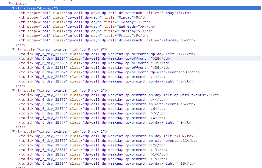 Can you find the html of the actual calendar? Look at the screenshot I attached to this for an example.