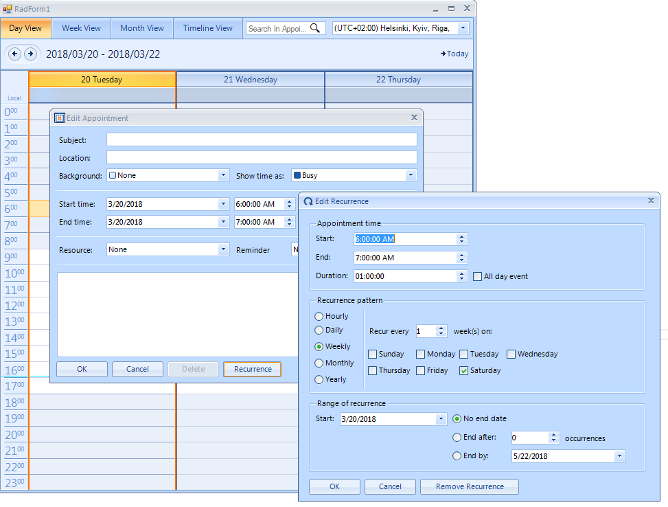 public RadForm1(){ InitializeComponent(); this.radScheduler1.RecurrenceEditDialogShowing += radScheduler1_RecurrenceEditDialogShowing;}CustomEditRecurrenceDialog dialog;private void radScheduler1_RecurrenceEditDialogShowing(object sender, RecurrenceEditDialogShowingEventArgs e){ if (dialog == null) { dialog = new CustomEditRecurrenceDialog(e.Appointment); } e.RecurrenceEditDialog = dialog; }public class CustomEditRecurrenceDialog : EditRecurrenceDialog{ public CustomEditRecurrenceDialog(IEvent targetEvent) : base(targetEvent) { } protected override void LoadSettingsFromEvent(IEvent sourceEvent) { WeeklyRecurrenceRule rrule = new WeeklyRecurrenceRule(); rrule.Start = (appointment != null) ? appointment.Start : DateTime.Now; rrule.WeekDays = WeekDays.Saturday; sourceEvent.RecurrenceRule = rrule; base.LoadSettingsFromEvent(sourceEvent); }}I hope this information helps. If you have any additional questions, please let me know.