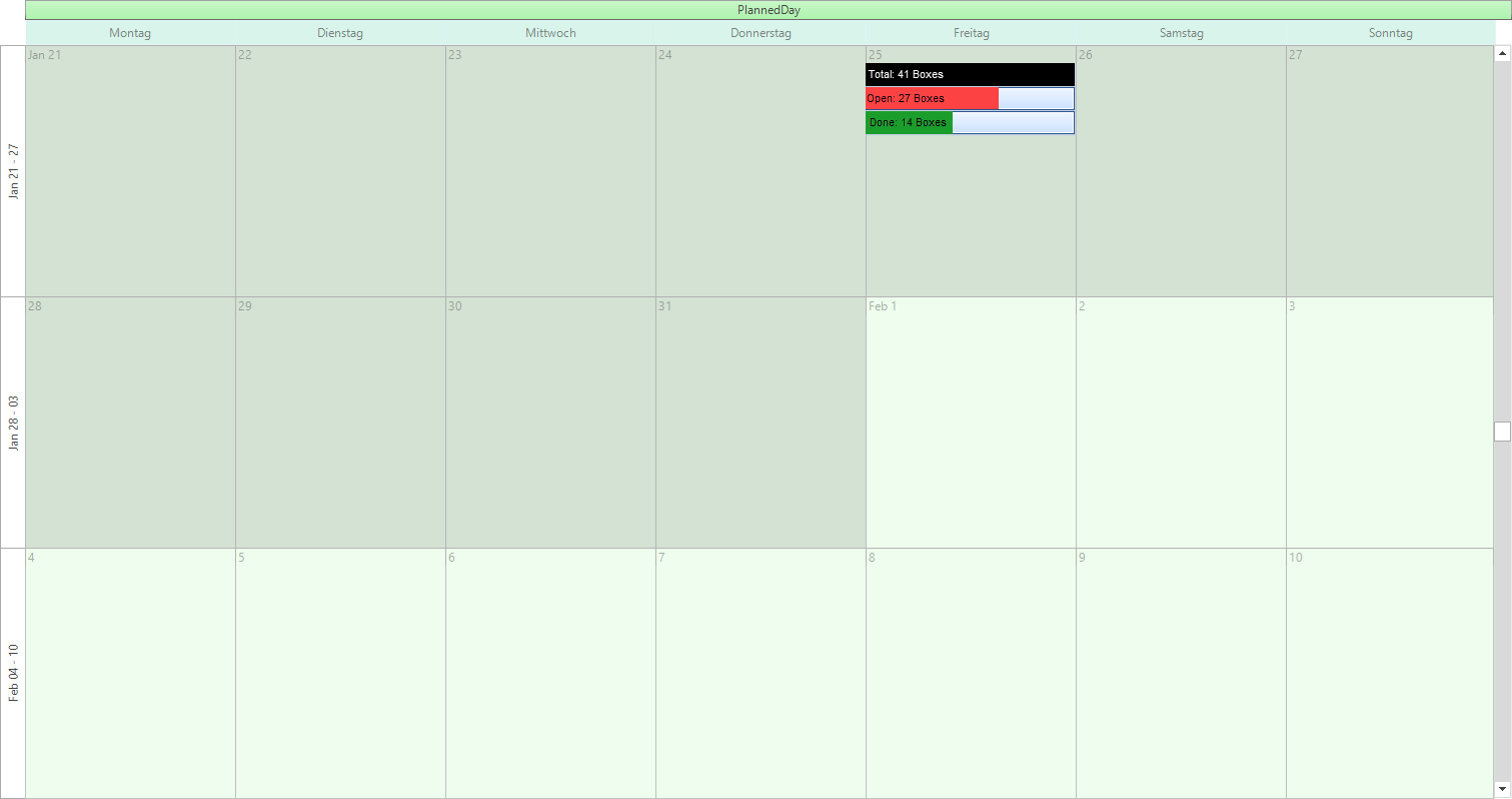 schedule.FocusedDate = DateTime.Today;schedule.Resources.Add(new Resource() { Id = new EventId(1), Name = "PlannedDay", Color = Color.LightGreen });schedule.GroupType = GroupType.Resource;schedule.ActiveView.ResourcesPerView = 2;schedule.Appointments.Clear();Appointment app1 = new Appointment(DateTime.Today.AddDays(2), new TimeSpan(0, 0, 5), "Total: 41 Boxes");Appointment app2 = new Appointment(DateTime.Today.AddDays(2), new TimeSpan(0, 0, 4), "Open: 27 Boxes");Appointment app3 = new Appointment(DateTime.Today.AddDays(2), new TimeSpan(0, 0, 3), "Done: 14 Boxes");app1.AllowEdit = false;app1.AllowDelete = false;app1.ResourceId = new EventId(1);app2.AllowEdit = false;app2.AllowDelete = false;app2.ResourceId = new EventId(1);app3.AllowEdit = false;app3.AllowDelete = false;app3.ResourceId = new EventId(1);schedule.Appointments.Add(app1);schedule.Appointments.Add(app2);schedule.Appointments.Add(app3);